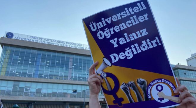Mersin Üniversitesi Mersin KYK Kız Yurdu’nda eylem yapan öğrenciler hakkında idari soruşturma açılmasına tepki gösteren Mersin Kadın Platformu, öğrencilerin barınma hakkının sopa olarak kullanıldığını söyledi. Ekrem İmamoğlu’nun tutuklanmasının ardından başlayan protestolara Mersin’den destek vermek isteyen üniversite öğrencilerine yurt yönetimi tarafından soruşturma açıldı. Mersin Üniversitesi Mersin KYK Kırkkaşık Kız Öğrenci Yurdu bahçesinde oturma eylemi yapan öğrencilerden biri “Yurttan Çıkarma” ile cezalandırıldı diğer öğrencilere ise idari soruşturma açıldı. Mersin Kadın Platformu, konuya ilişkin yurt önünde basın açıklaması yapmak isterken polisin müdahalesi ile karşı karşıya kaldı. Belirlenen yerde açıklama yapılmaması halinde kadınlar gözaltına…