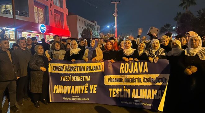 Mersin’de Barış Anneleri ve kadınların öncülüğünde, Suriye Geçici Hükümetinin Halep’te Kürtlere dönük saldırılarına karşı kitlesel bir yürüyüş düzenlendi. Yürüyüşte Rojava’ya dönük saldırıların boşa çıkarılacağı vurgulanırken, uluslararası kamuoyuna sessizliği bozma çağrısı yapıldı. Mersin Demokratik Kurumlar Platformu, Suriye Geçici Hükümetinin Halep’te Kürtlere dönük saldırılarına tepki göstermek amacıyla kitlesel yürüyüş düzenledi. Yürüyüşe Halkların Eşitlik ve Demokrasi Partisi (DEM Parti) il ve ilçe yöneticileri, DEM Parti Mersin Milletvekilleri Perihan Koca ile Ali Bozan, Barış Anneleri, İnsan Hakları Derneği Mersin Şubesi, Özgürlük için Hukukçular Derneği ve çok sayıda yurttaş katıldı. Şevket Sümer Mahallesinde bulanan Barış…