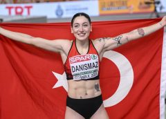 Milli atlet Tuğba Danışmaz, Avrupa Salon Atletizm Şampiyonası kadınlar üç adım atlama finalinde 14.31’lik derecesiyle Türkiye rekoru kırarak altın madalya kazandı. 2023 Avrupa Salon Atletizm Şampiyonası’nda kadınlar üç adım atlamada milli sporcu Tuğba Danışmaz, altın madalya elde etti. Ataköy Atletizm Salonu’nda düzenlenen şampiyonada, kadınlar üç adım atlamada madalyalar sahiplerini buldu. Milli atlet Tuğba Danışmaz, ilk denemesinde 14.31 metrelik atlayışıyla Türkiye rekoru kırarak Avrupa şampiyonu oldu. Tuğba, Türkiye’ye şampiyonadaki ilk madalyasını getirdi. Müsabakada İtalyan Dariya Derkach, 14.20’lik derecesiyle gümüş, Portekizli Patricia Mamona ise 14.16 metreyle bronz madalya aldı. Paylaş