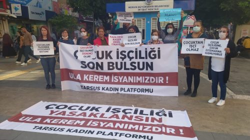 İki gün önce Tarsus’ta bir narenciye fabrikasında paketleme işçisi olarak çalışan 13 yaşında bir kız çocuğu Ula Kerem eşarbının iş makinesine takılması sonucu iş cinayetinde hayatını kaybetmişti. Onu kurtarmaya çalışan bir başka kız çocuğu ise kolunu makineye kaptırarak yaralanmıştı. Yaşanan bu olay üzerine Tarsus Kadın Platformu, Yarenlik Alanında basın açıklaması yaparak çocuk işçiliğine ve iş cinayetlerine dikkat çekti. “Çocuk işçiliği son bulsun, Ula Kerem isyanımızdır” yazılı pankartın açıldığı eylemde “Susma haykır çocuk işçiliğine hayır”, “Ula Kerem isyanımızdır”, “Bağır herkes duysun çocuk işçiliği son bulsun”, “Bağır herkes duysun çocuk istismarı son bulsun” sloganları atıldı.
