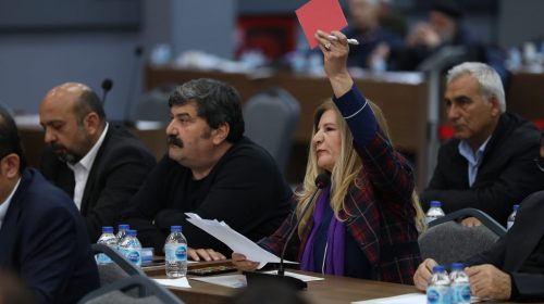 Mersin Büyükşehir Belediye Meclisi Mart ayı birleşiminde söz alan Halkların Demokratik Partisi’nden Meclis üyesi Bedriye Kuş, 6 Şubat’ta meydana gelen deprem, Bursaspor ve Amedspor karşılaşmasında yaşananlar ve 8 Mart’a değindiği konuşmasının sonunda kırmızı kartı gösterdi.