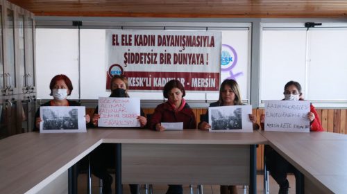 Kamu Emekçileri Sendikaları Konfederasyonu (KESK) Mersin Kadın Meclisi, Diyarbakır’da “25 Kasım Kadına şiddete karşı” yapılan eylem ve etkinlikler gerekçe göstererek KESK’li kadın yönetici ve üyeler başta olmak üzere yapılan gözaltılarla ilgili olarak basın açıklaması gerçekleştirdi. Eğitim Sen Şube binasında yapılan açıklamada, “El ele kadın dayanışmasıyla şiddetsiz bir dünyaya” pankartı ve “Kadın müdahalesi engellenmez”, “Gözaltına alınan kadınlar derhal serbest bırakılsın” dövizleri açıldı.