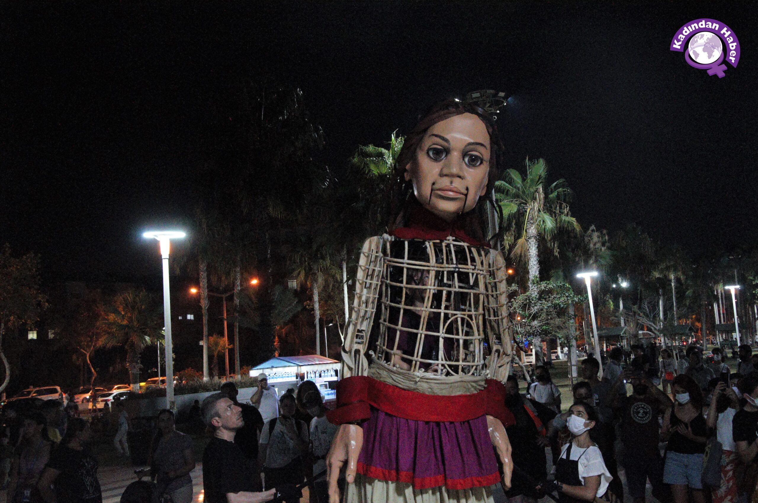 Suriyeli mülteci çocukların yaşadığı sorunlara dikkatleri çekmek için tasarlanan 3,5 metre boyundaki Suriyeli bir kız çocuğunu canlandıran ‘Amal’ ismi verilen kuklanın yolu Mersin’den geçti. Gaziantep’te göç yolcuğu başlayan küçük kız çocuğu Amal, denizi ilk kez Mersin’de gördü.