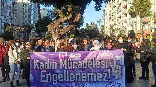 Özgür Çocuk Parkında bir araya gelen kadınlar ‘Kadın mücadelesi engellenemez’ pankartı taşıdı. Mersin Kadın Platformu adına açıklamayı okuyan Çiğdem Göksoy “Bu sabah Diyarbakır’da Roza Kadın Derneği, TJA, HDP ve KESK Amed Kadın Meclisi aktivistlerinin de aralarında bulunduğu en az 24 kadın gözaltına alındı. Dosyada kısıtlılık kararı olduğu söylenerek bilgi verilmemişse de başta 25 Kasım ve 8 Mart olmak üzere kadınların eşitlik ve özgürlük mücadelesine yönelik eylem ve etkinliklerin gerekçe yapıldığı tahmin edilmektedir.” dedi.