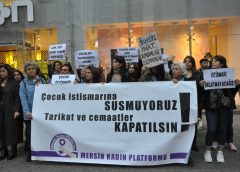 Mersin’de kadınlar, Hiranur Vakfı’nda yaşanan çocuk istismarını protesto ederek, “Çürümüş erkek iktidarınızı yıkacağız” dedi. Mersin Kadın Platformu, Pozcu’da yaptıkları basın açıklamasıyla İsmailağa Cemaatine bağlı Hiranur Vakfı kurucusu Yusuf Ziya Gümüşel’in 6 yaşındaki kızını müridi ile evlendirmesine tepki gösterdi. “AKP elini çocuklardan çek” sloganlarının atıldığı açıklamaya çok sayıda kadın katıldı. Platform adına basın metnini okuyan Elmas Kara, “Tarikat ve cemaatler kapatılsın. İstismarın aklanmasına, üstünün örtülmesine izin vermeyeceğiz!” diye konuştu. “Çocuk istismarı politiktir” Aile Bakanı Derya Yanık’ın konu ile ilgili açıklamalarını istismarın olağanlaştırması anlamına geldiğini söyleyen Elmas Kara, “Bir kadının çocukluğu boyunca…