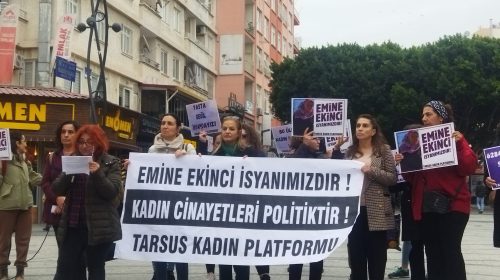 Mersin’in Tarsus ilçesinde Mahsun Ekinci adlı erkek evli olduğu Emine Ekinci’yi katletmişti. Cinayeti ve erkek şiddetini protesto etmek isteyen Tarsus Kadın Platformu Halk Eğitim binası önünden Yarenlik alanına kadar sloganlarla yürüyüş gerçekleştirdi. ‘Emine Ekinci isyanımızdır, kadın cinayetleri politiktir’ yazılı pankart açılarak meydanda basın açıklaması gerçekleştirildi.