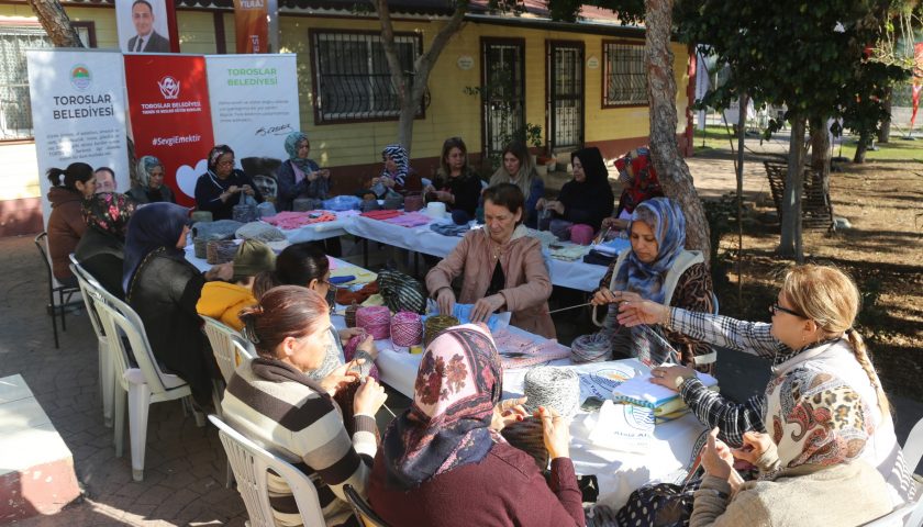 Toroslar Belediyesinin Teknik ve Mesleki Eğitim Kursları Merkezinin (TORTEK) eğitmenleri ve kursiyerleri, deprem bölgesine gönderilmek üzere atkı, bere, patik, ceket ve şal örüyor.